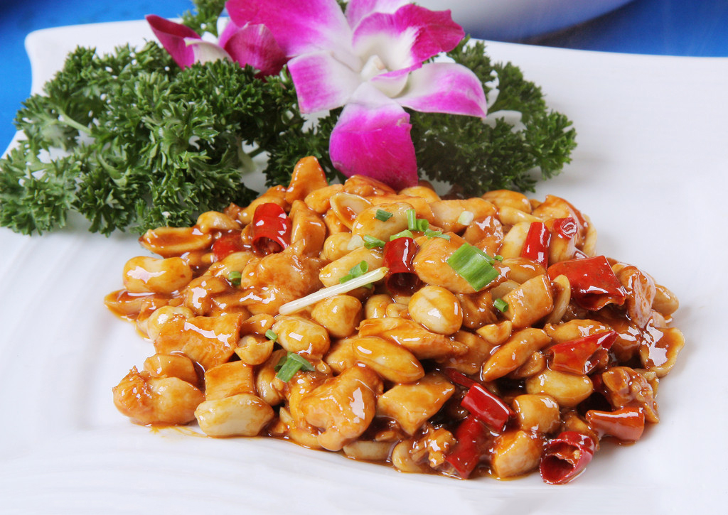 制作材料:鸡肉(鸡脯或鸡腿肉)200克,花生米50克,干辣椒4只,花椒20粒,蒜、红白酱油、醋、料洒、鲜汤、姜、葱、酱油、糖、生粉各适量。
