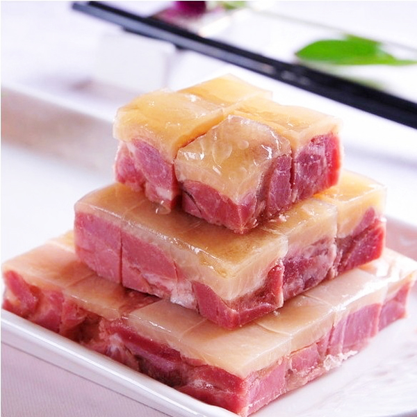 水晶肴蹄,又名水晶肴肉,是江苏镇江区汉族传统名菜,属于苏菜系,迄今已有300多年的历史。水晶肴蹄成菜后肉红皮白,光滑晶莹,卤冻透明,犹如水晶,故有"水晶"之美称。食用时,具有瘦肉香酥、肥肉不腻、酥香嫩鲜等特点,佐以姜丝和镇江香醋,更是别有一番风味。有诗赞曰:"风光无限数今朝,更爱京口肉食烧,不腻微酥香味溢,嫣红嫩冻水晶肴。"